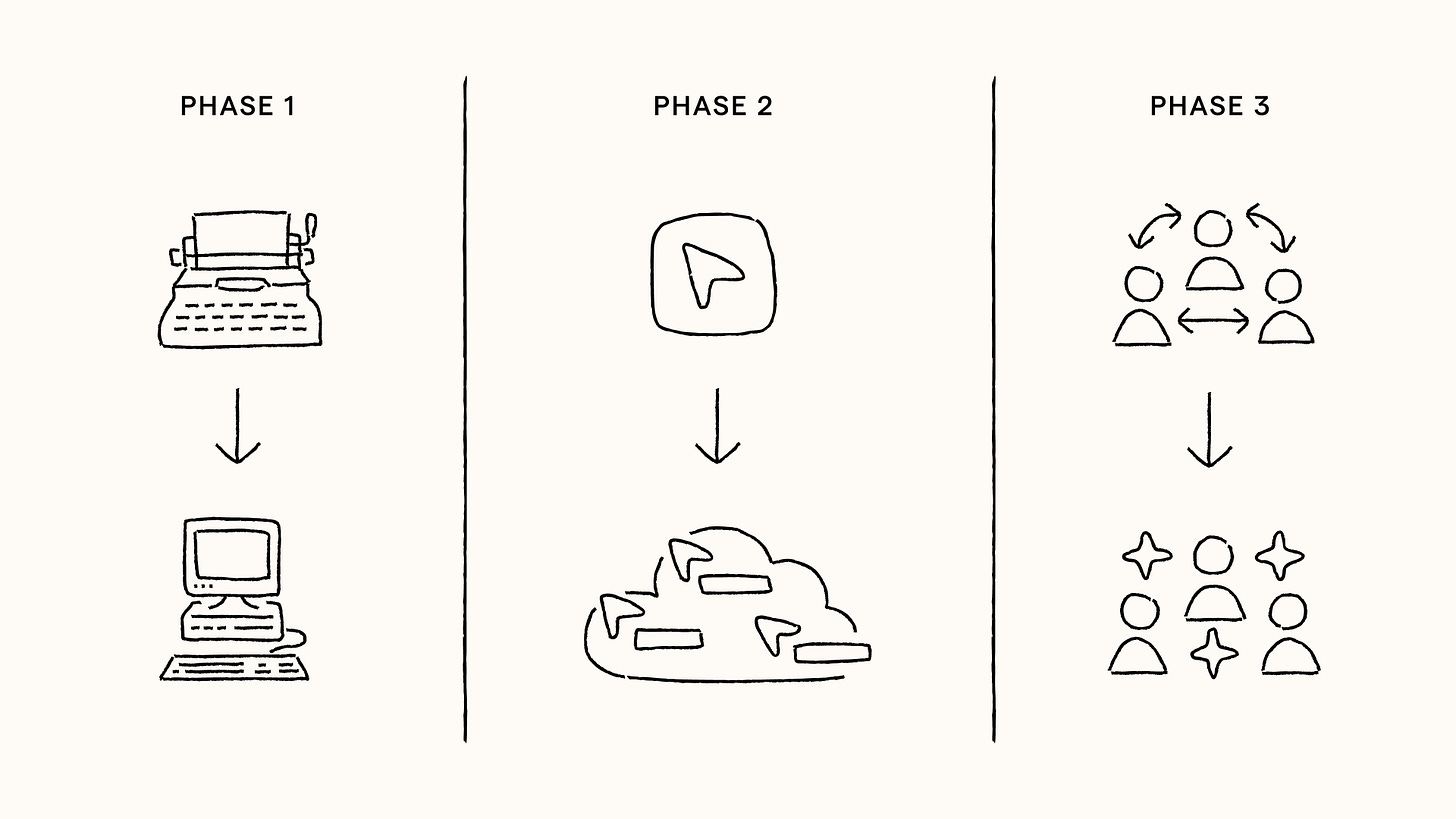 I’ve seen three distinct phases unfold. In Phase 1, digitization moved us from typewriters to word processors: same work, just faster. In Phase 2, collaboration tools like Google Docs (and then Coda) and Slack brought us into the cloud, where we could finally work together in real time.